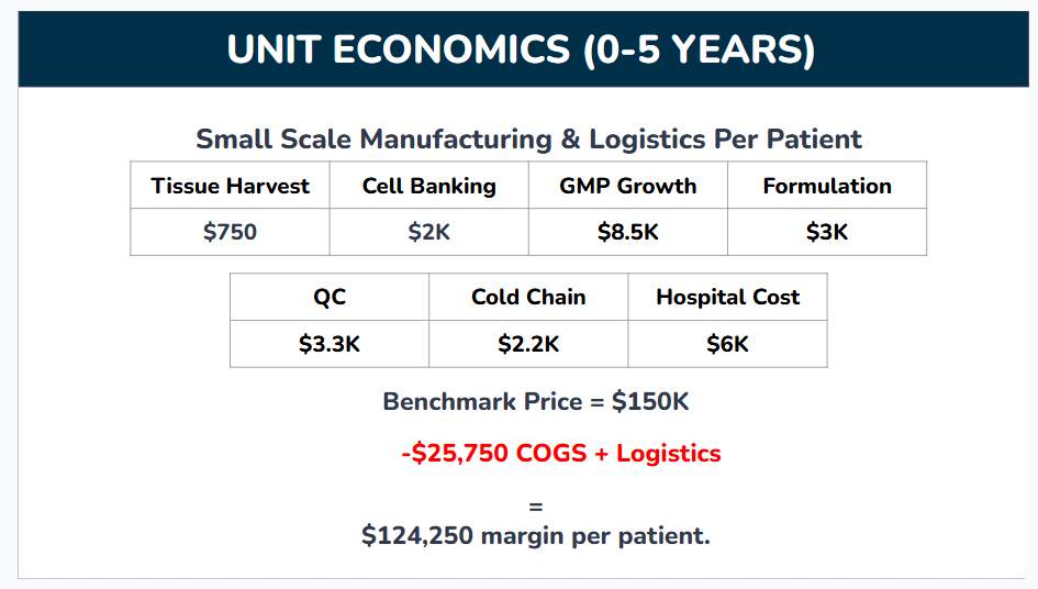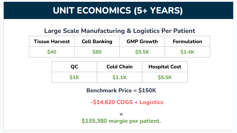 These unit economics are decent for a cell therapy, but they’ll only improve with time. Some costs, such as the tissue harvest, cell banking, and QC, will drop sharply as we serve more patients. Others, such as cold chain logistics and GMP costs, will decline modestly as we benefit from economies of scale. I’ve estimated the unit economics of our therapy after our first five years of operation in the following table: