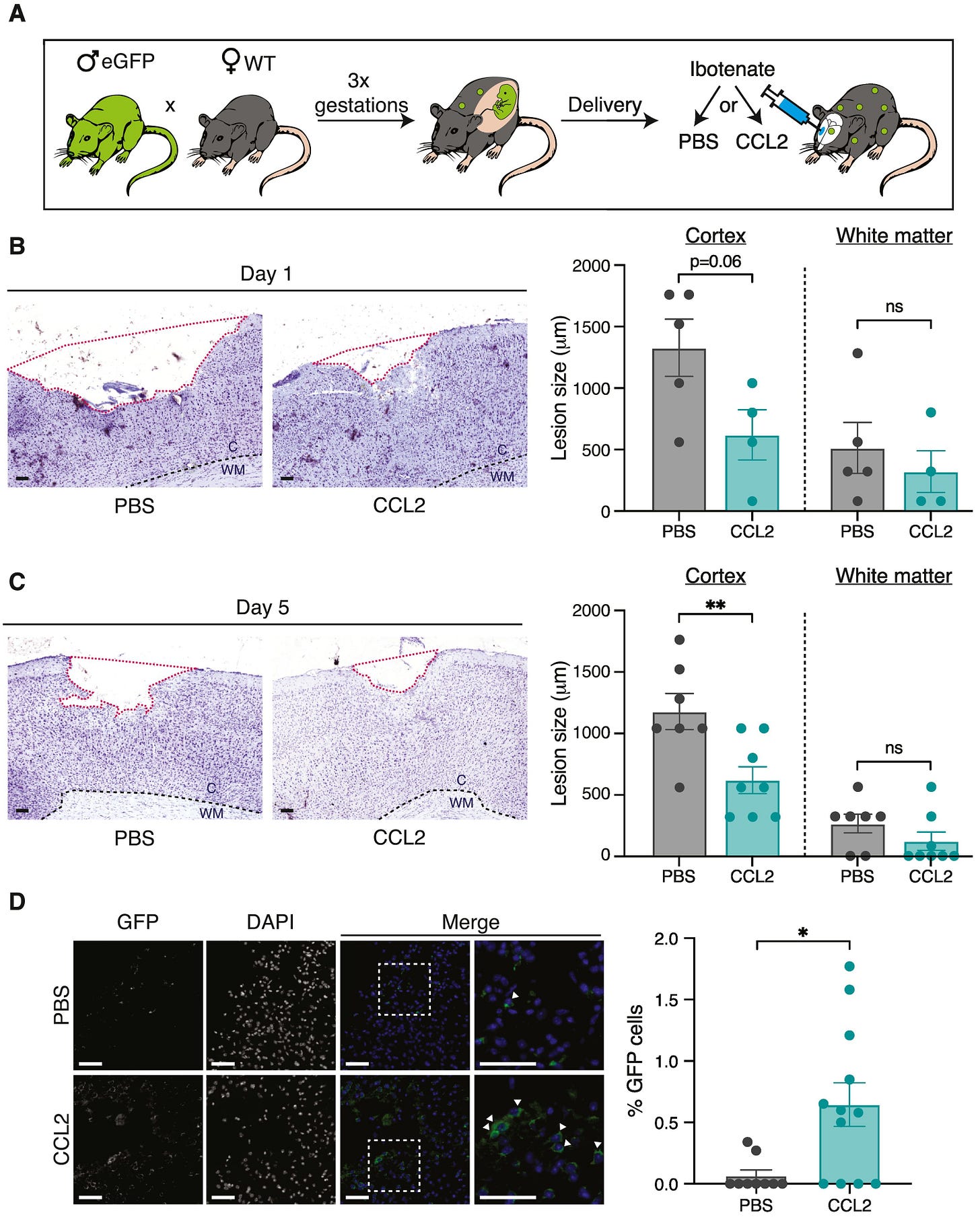 These studies from Gavin Dawe’s lab did much to characterize this rare population of brain targeting fetal cells and describe how they behaved in injured vs uninjured models, but didn’t make any attempts to use them as a therapy. I’m not yet aware of any lab which has purified the brain targeting FMSC population and used it as an allogeneic treatment against a set indication as described in the Chaudry lab’s earlier works, but Dr. Sélim Aractingi’s lab at the Université Paris Cité came closest to that in 2022 with this paper. Here, they injected CCL2 (a chemokine known to attract brain trafficking fetal origin cells) directly into the brains of wild-type female mice which had previously given birth to three GFP+ litters. This treatment increased FMSC concentration in the brain by 10x compared to untreated controls, serving as a proxy for the possible effects of injecting high concentrations of brain trafficking FMSCs directly. Similar to earlier studies in the Dawe lab, the authors chemically induced ischemic stroke-like lesions in the brains of some of their mice. Injecting lesioned brains with CCL2 caused more FMSCs to integrate into the lesions, shrinking their size by half five days after treatment.